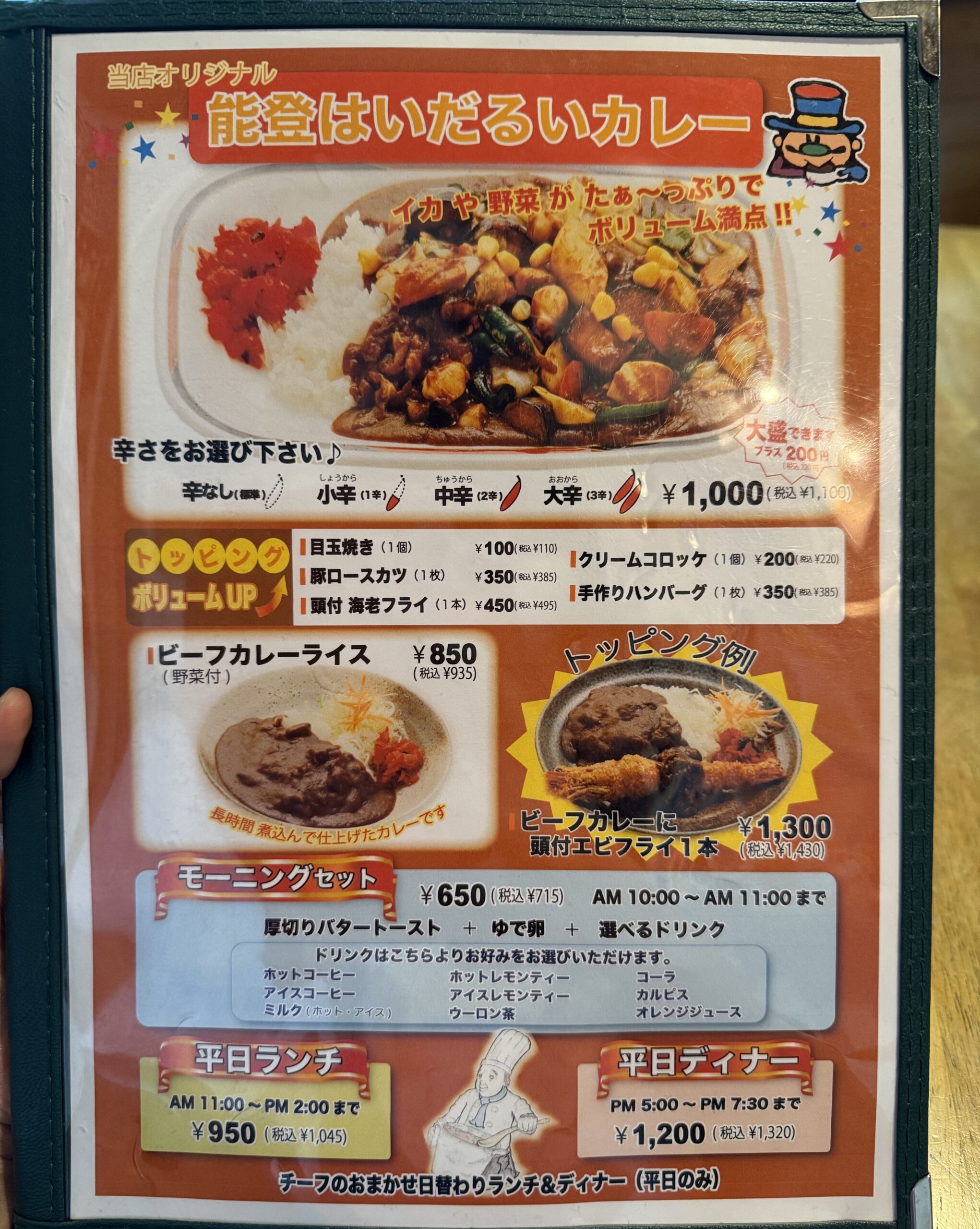 和倉温泉駅の真ん前にある名物喫茶店で、オリジナルカレー「はいだるいカレー」が有名。