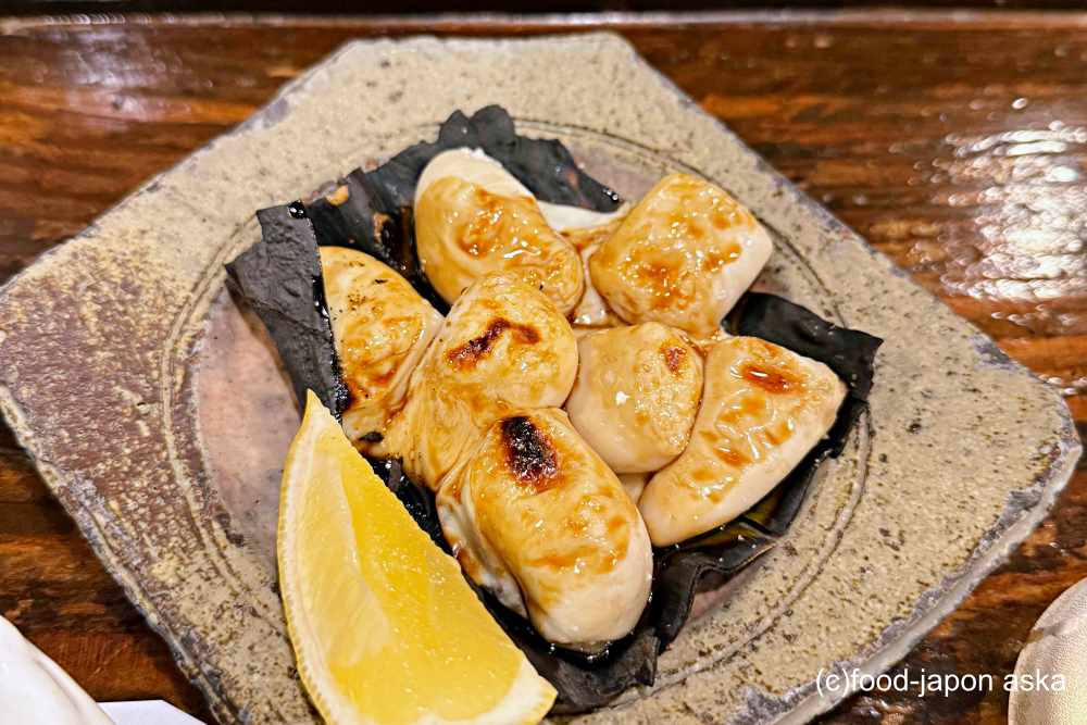 鱈の白子を昆布の上に乗せて焼いた松前焼きは、酒の肴としても最高。うっすら狐色に焦げた表面は香ばしく、白子のミルキーなうまさに、お醤油と昆布の旨味が重なり美味。ああ幸せ。