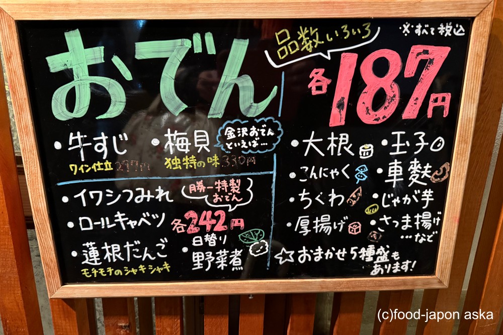 金沢駅から程近くになる、おいしくてとっても手頃なおでん居酒屋。