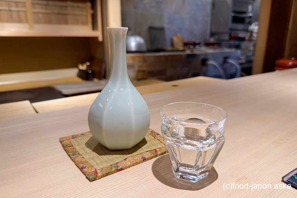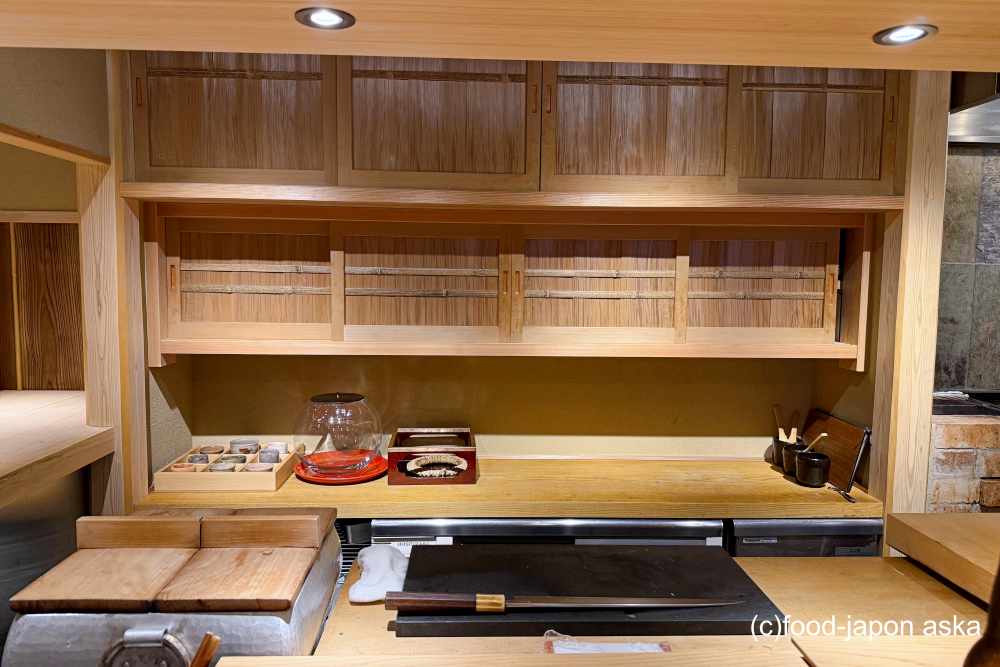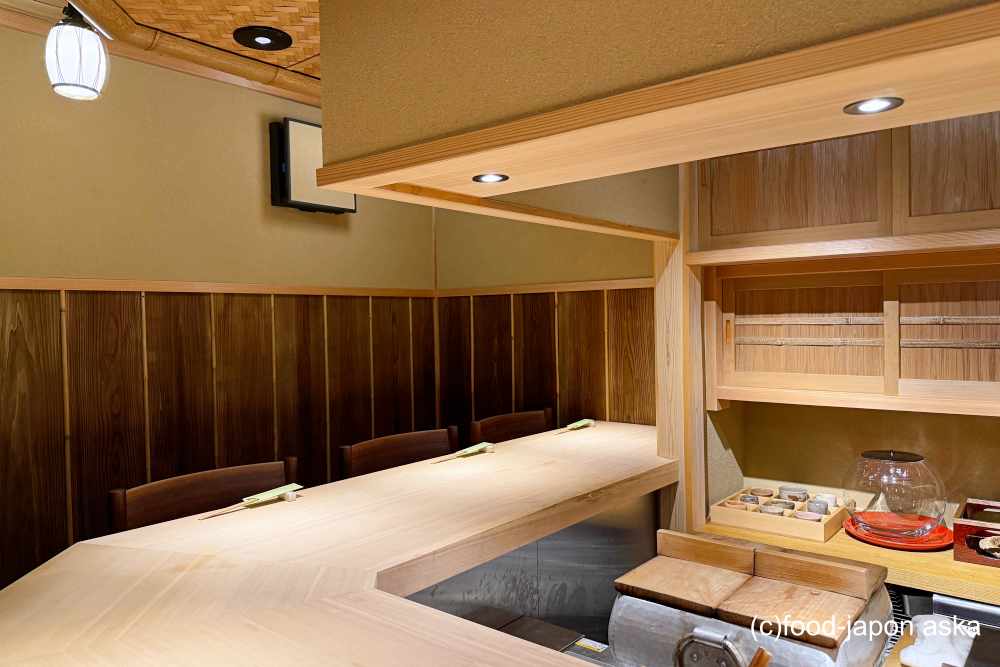玄関扉を一枚隔てて、洗練された空間が広がっているので、初訪問だとかなりびっくりします。席はL字カウンターに9席で、厨房が見渡せる造りなので、調理の臨場感もあり。