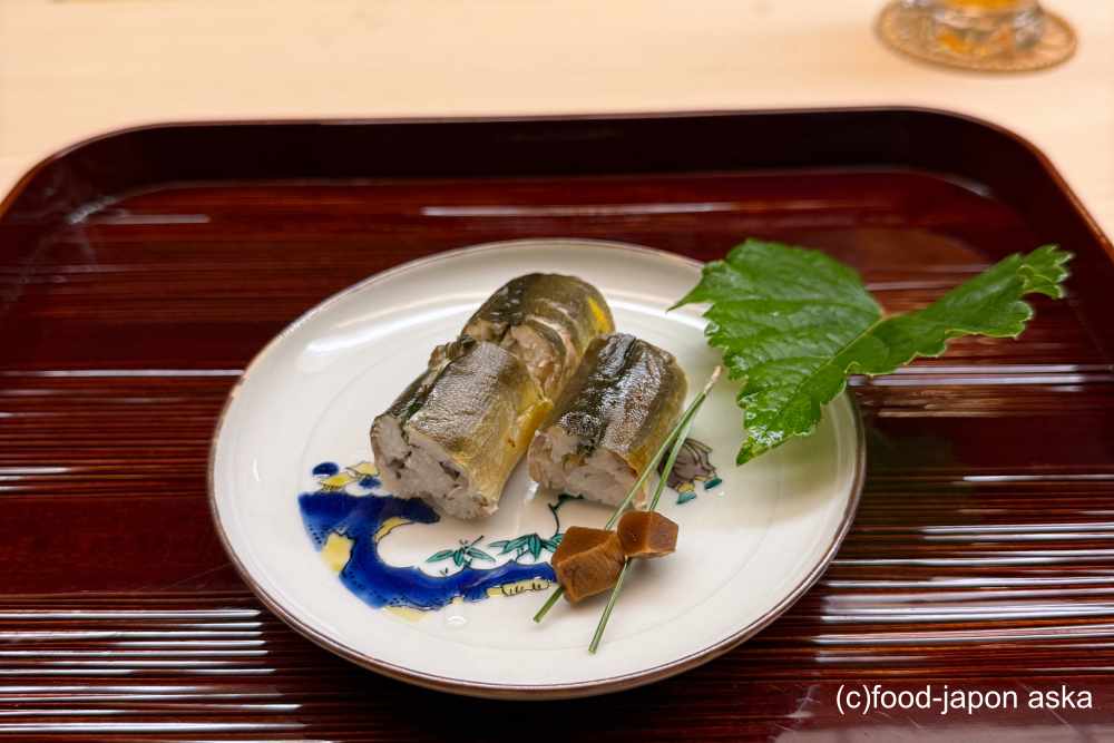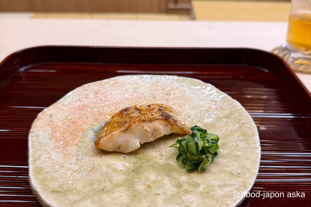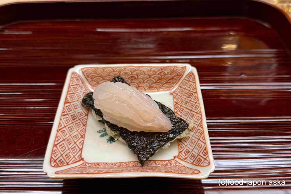 「片折」でも記憶に刻まれた珠玉の一品。ここで食べられるのは嬉しい。蒸すことによってやわらかくなったお酢の当たりと、甘さが増したご飯のほこほこの温かみと甘さが、のど黒の脂と絡み合う。
