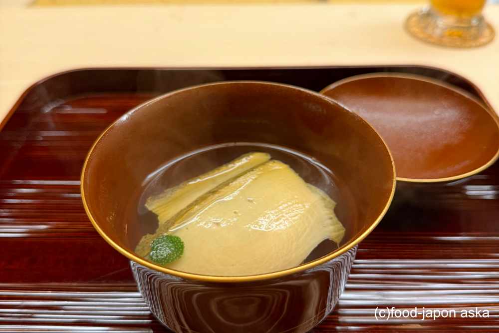 蓋を取った瞬間、品格のある吸地の香りが立ちのぼる。幅広の鮑は、滑らかでてろんとした舌触りが美味。吸地との一体感が高く、シンプルながらその奥行きに思わず溜息がこぼれます。