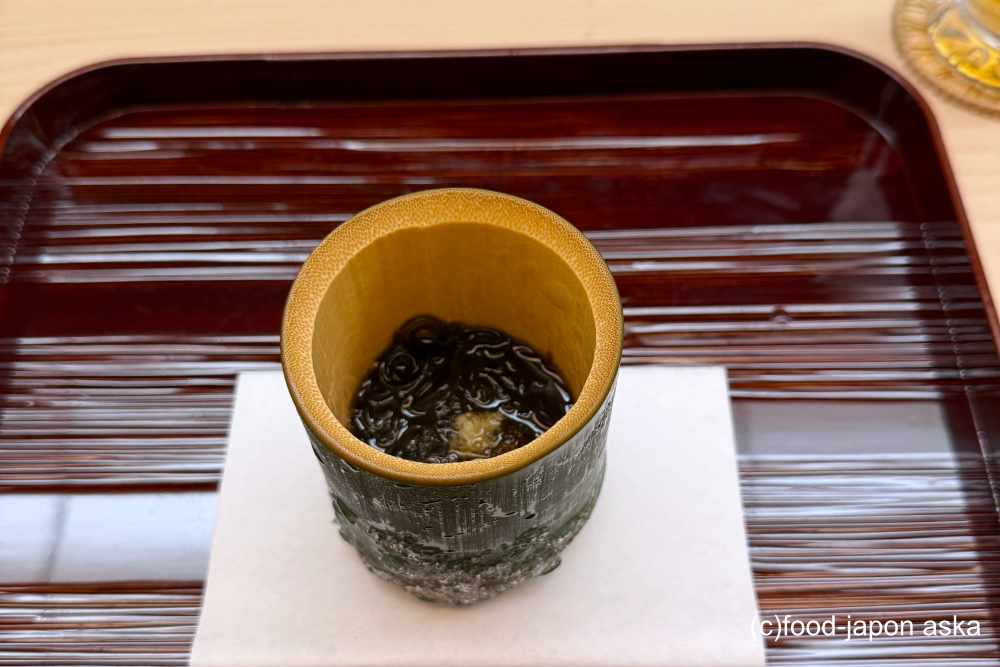 澄み切った山の水のおいしさに、能登椎茸の旨味が溶け合うプロローグ。口に含んだ瞬間、まるで森の奥に分け入ったような感覚を覚えます。
