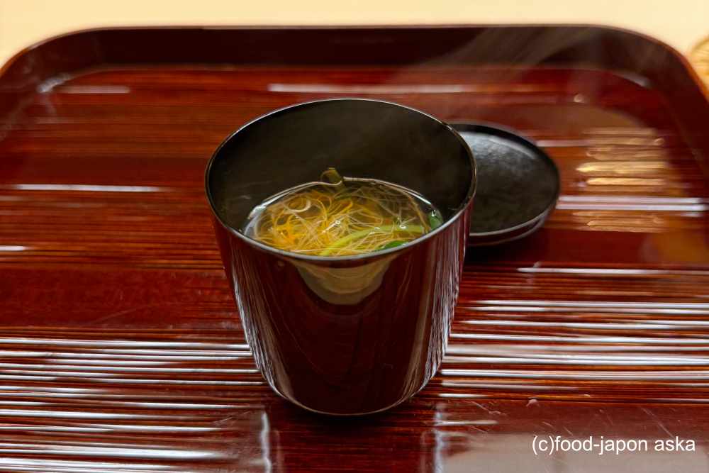 お野菜は針のように細く、驚くほど正確に、均一に切り揃えられ、まるで絹糸のようです。包丁技術の高さを無言で伝えてくれる一品。