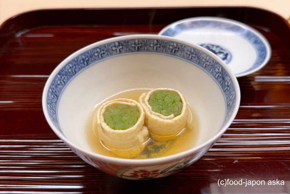 新玉ねぎの優しい甘さが吸地に溶け合い、くずうちされてふわふわなアイナメとの調和も素晴らしい。
