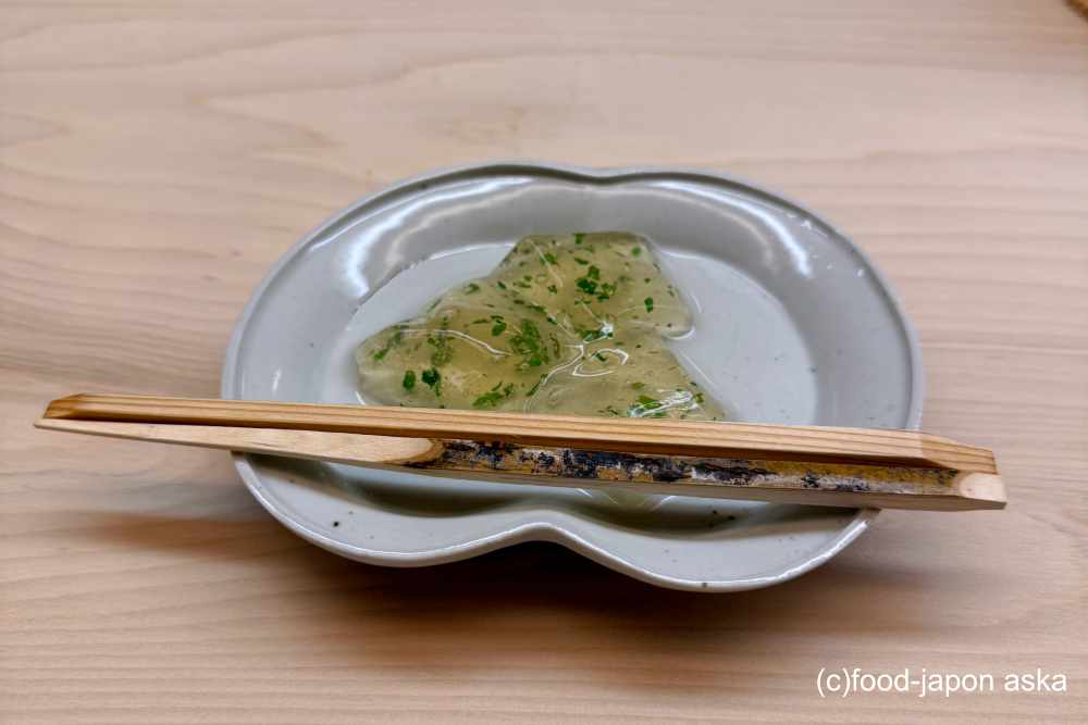 食後のわらび餅は、透明感と清涼感に満ち、弾力と柔らかさの絶妙なバランス。木の芽の香りがそっと鼻に抜け、この季節の締めにふさわしい涼やかさ。ここにも素材を生かしながら、遊び心を忍ばせるセンスが光ります。