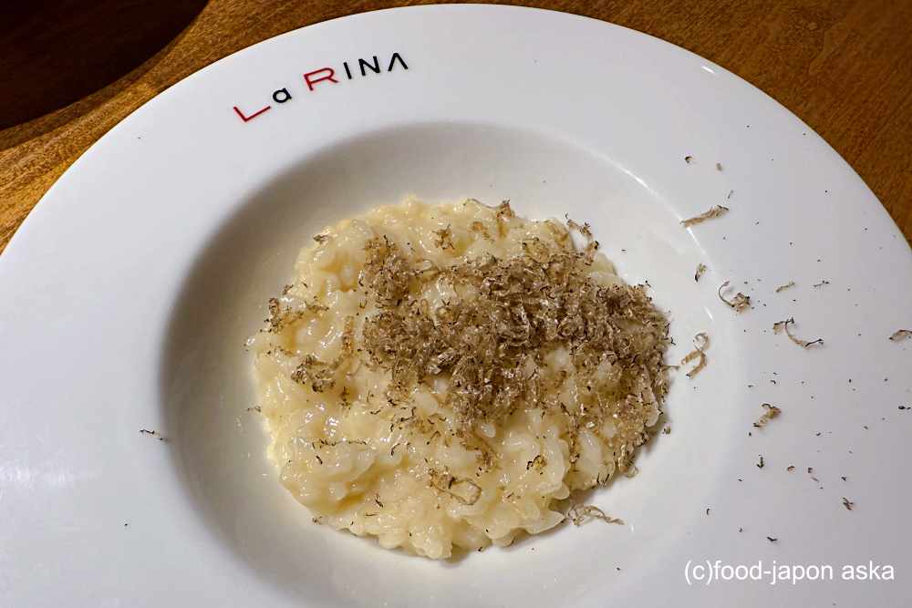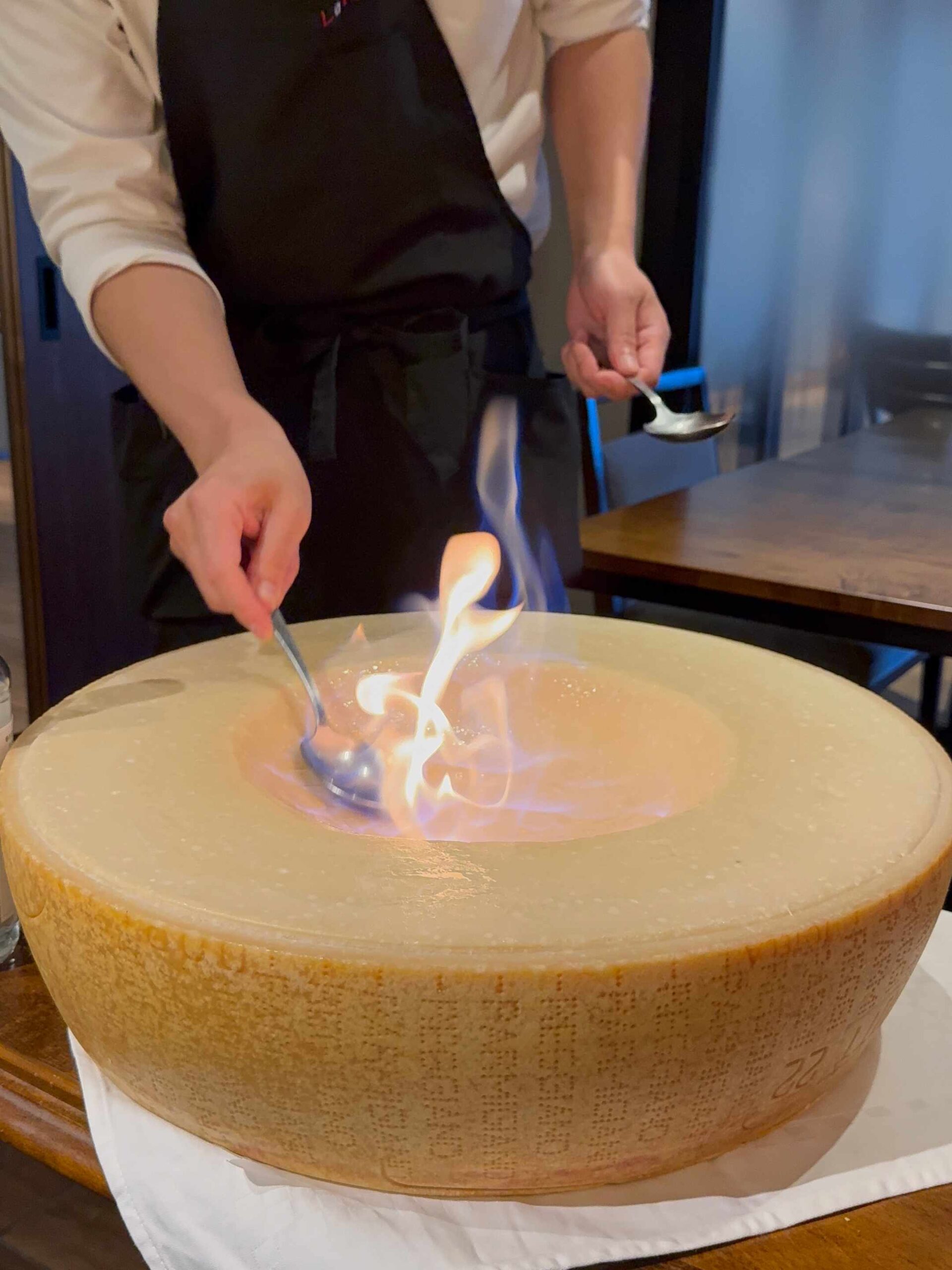最初に大きなホール状のパルミジャーノの中をアルコールでひたひたにし、目の前で着火。炎の熱でチーズがとろけたら、そこに石川県能美市産のイタリア米を投入し、丁寧に絡めます。仕上げには黒トリュフを削りかけて風味豊かに。