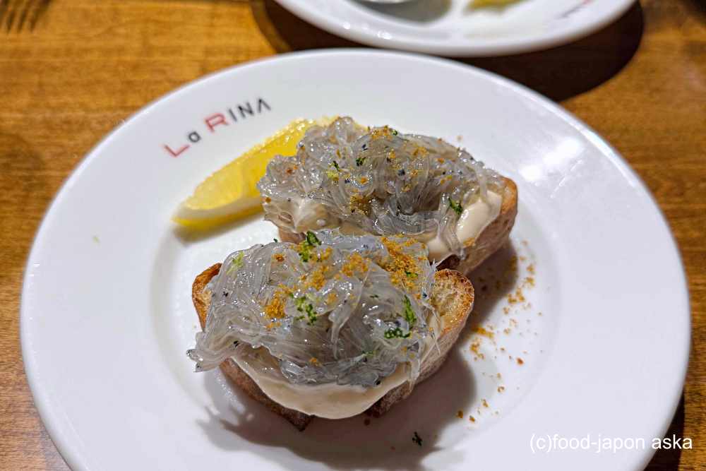 ・生シラスとカラスミクリームのブルスケッタ(2P 800円)