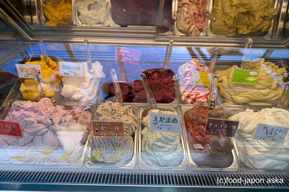 グランピスタチオ、プレミアムミルク、マルカルポーネとオレンジバニラ、すもも、ドラフトビール、チョコラータ、マンゴー、珠洲産・能登の塩、えだまめ、能登産ブルーベリー