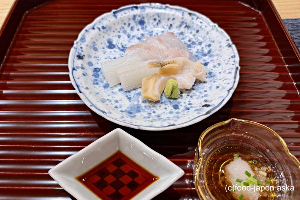 ・お造り 石川県産シロガレイ、石川県産バイ貝、石川県産アカイカ