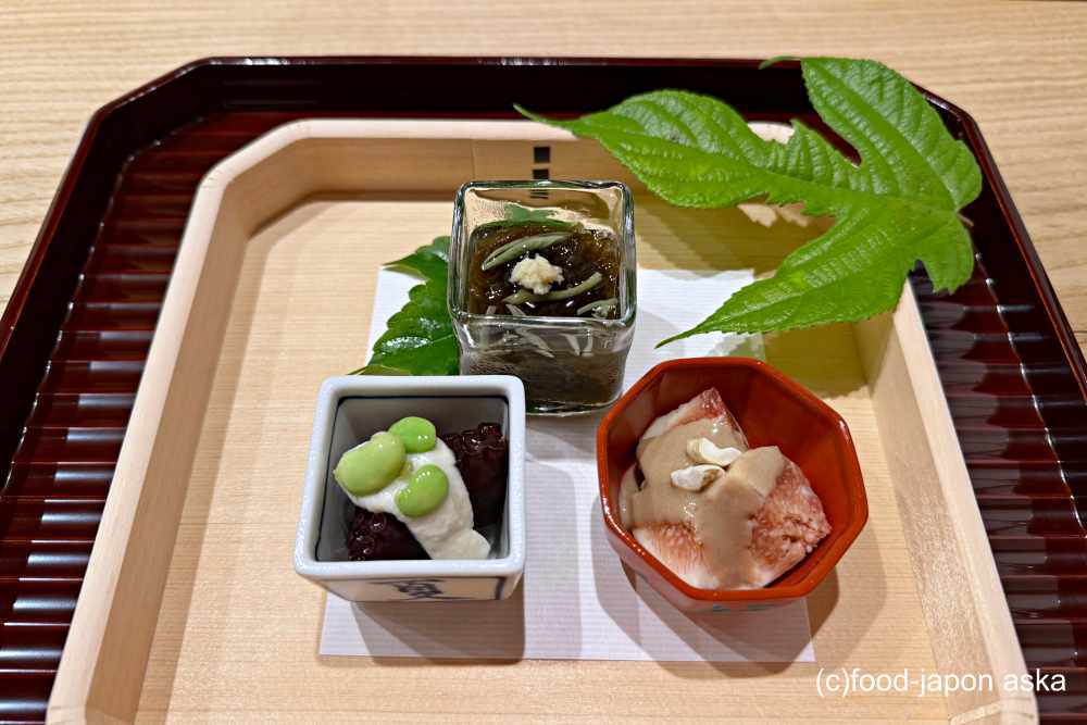 沖縄県産モズク、無花果ゴマだれがけ、タコのうま煮