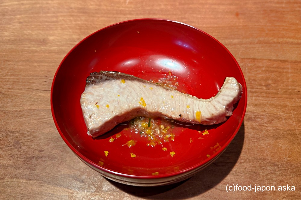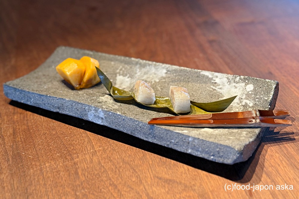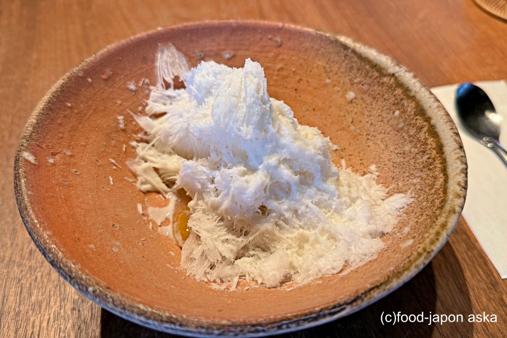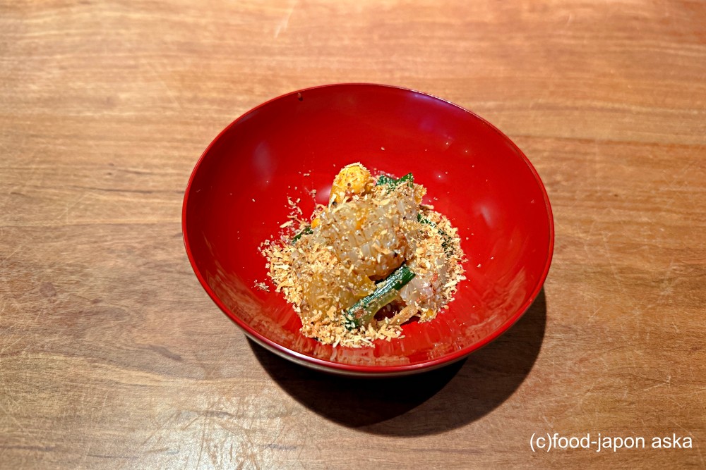 絶妙な火入れのアオリイカに能登の魚醤が上品に重なります。そこに柑橘がところどころに弾けて、フレッシュな酸味と香気を放ちます。