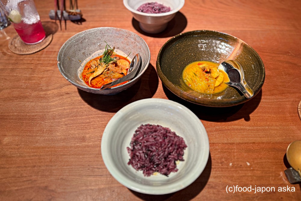 終盤にタイカレー(汁物)が2種類。冴えた酸味やハーブの風味で、今一度タイ料理らしさを印象付けられる。