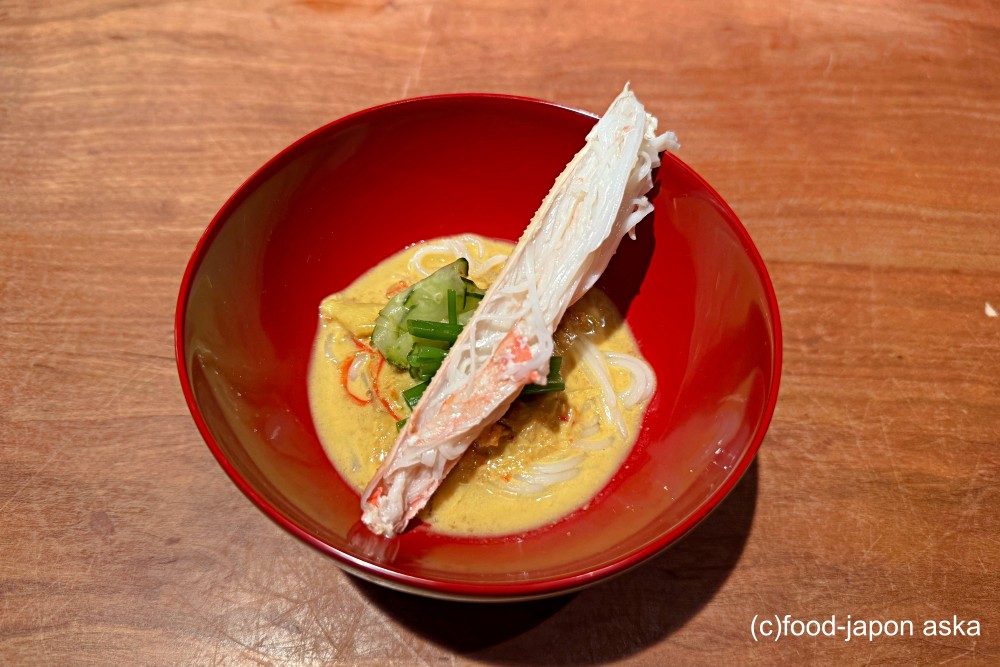 ふあふあとしたカニの身を解き、米粉麺に絡ませて。食材に寄り添い引き立てる、控えめ過ぎず強過ぎない旨みの効いたスープが素晴らしい。