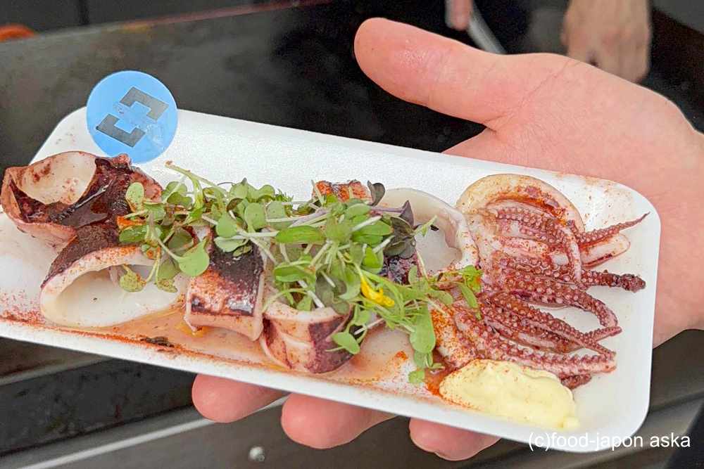 屋外イベントの定番・イカ焼きをスペイン風にアレンジ。現代的な感性で仕上げられた一品で、ワインとの相性も抜群です。