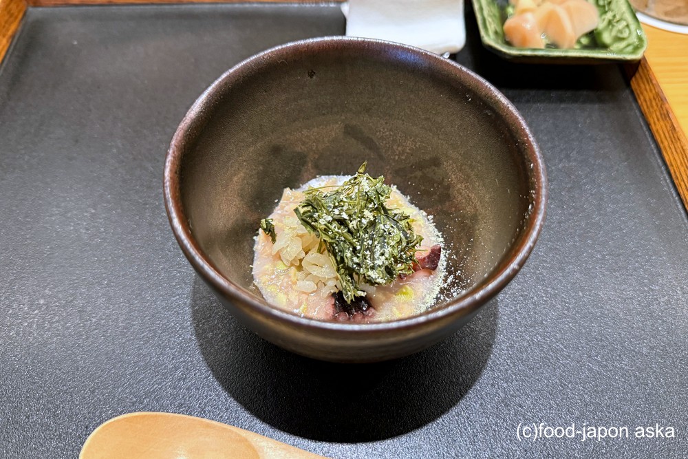 水タコを干したタコ節を仕上げに削って。海藻スガモの青い香りも美味。