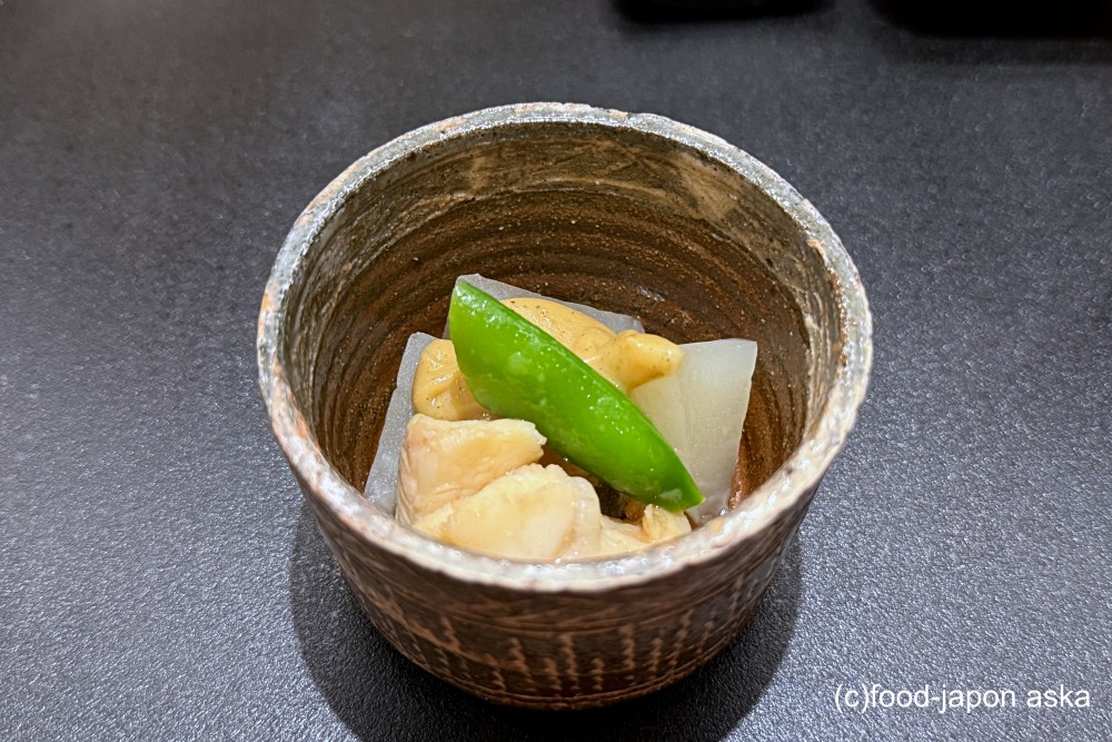 高級なオトナのリゾットと言ったところでしょうか。ミルクは入れておらず、シャリにフグの白子を合わせてあります。玉ねぎの甘さがイイ仕事をしている。終盤に再び胃袋が興奮する一品。