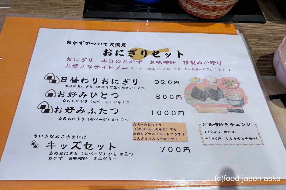 価格帯 日替わりおにぎりセット(920円)、おこのみひとつセット(800円)、おこのみふたつセット(1000円)