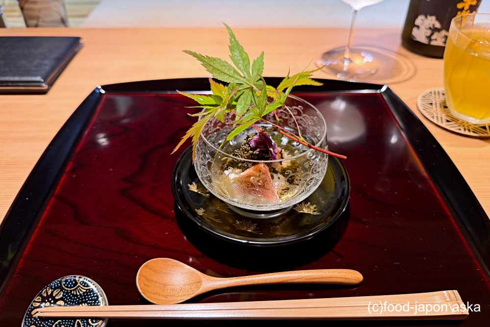 ユメカサゴととろっとおいしい熊本の赤茄子が甘やかさを添える構成。添えられた鯖江の伝統薬味「山うに」もアクセントに引き締めます。