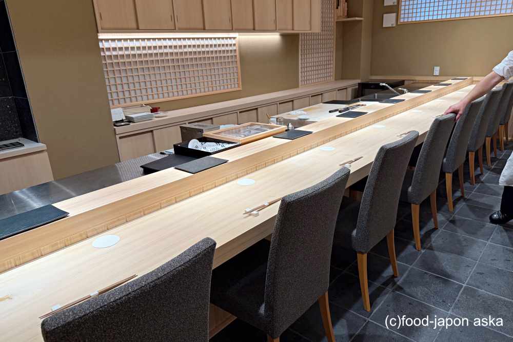 目を引くのは、長さ6メートルの一枚板カウンター。樹齢145年の吉野檜が据えられ、堂々たる存在感と、木の温もりに満ちた凛とした空気を醸し出しています。この一枚板を搬入するのは容易ではなかったと言いますが、空間に生まれた品格はお見事です。