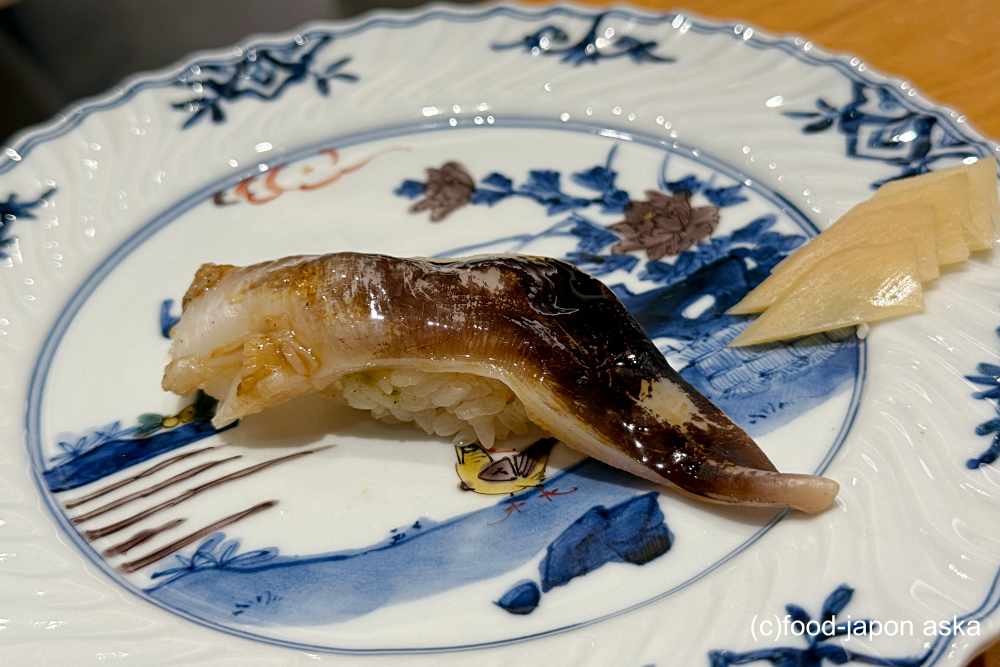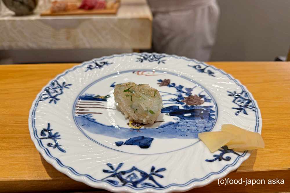 お米は石川県産コシヒカリの新米と古米のブレンドで、お酢は赤酢と米酢にさらに数種類をブレンドしてあり、コクがあるけどまろやかで軽い絶妙な加減。この古米ブレンドが良く、効果的にご飯の輪郭を出し、咀嚼させることで湧き出る旨味が、ブレンドされた赤酢に調和し美味でした。シャリの形状は丸みのある卵型に握られているのが特徴的で、温度にも気を配ってあります。
