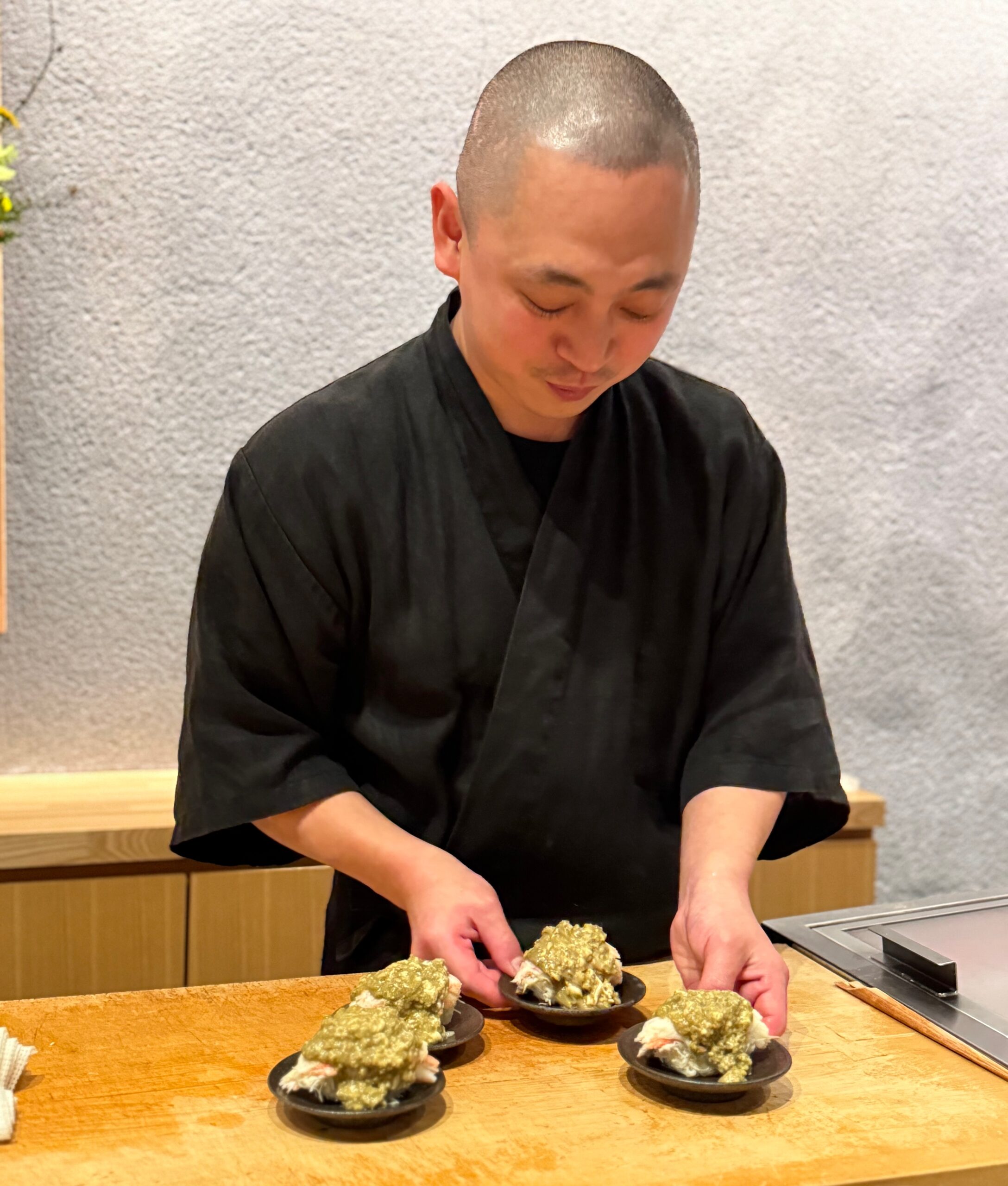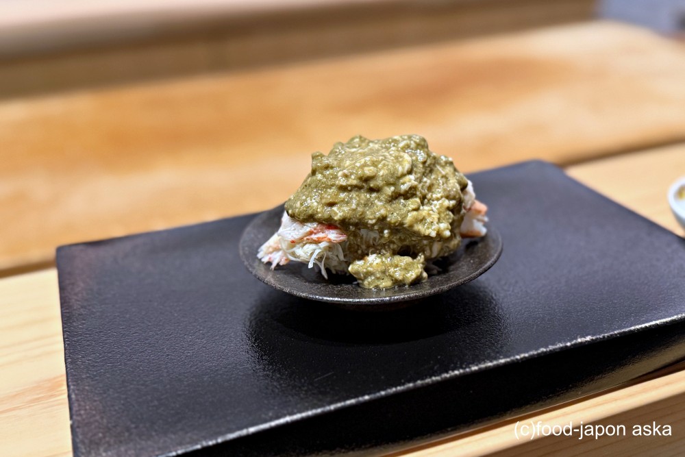 インパクト大!ズワイガニの身をたっぷり混ぜ込んだシャリに、太いカニ足を乗せ、仕上げにカニ味噌をたっぷりかけて。カニ味噌を堪能して欲しいという思いで考案したというだけあって、濃厚で繊細なおいしさが印象的な一品でした。