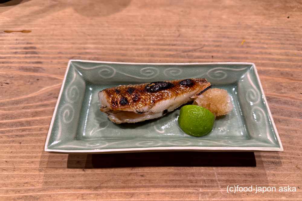 軽く炙ってから能登の薄口醤油をサッと塗り粗塩を施す。炙りの香ばしさにスダチと穂紫蘇の爽やかな風味が乗り、能登の粗塩が味わいを引き締めています。