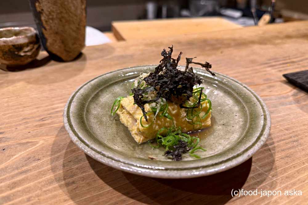 ふるふる熱々のだし巻たまごに、細かく刻まれたたタコが入っています。タコの旨みと優しい弾力に、生姜の爽やかな風味がスッと抜け、後から岩のりの海の香りが追いかけてきます。