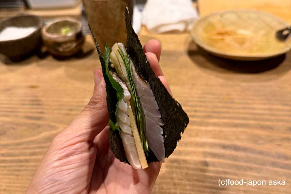 表面を香ばしく炙ったヤナギザワラを、ガリと芽ねぎとともに海苔で巻いて、ヒョイっと手渡しで提供されます。海の風味に、ガリの清涼感がアクセントに。