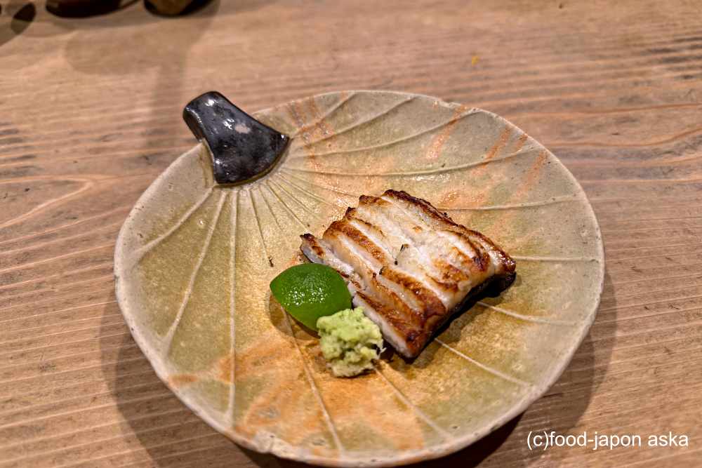 皮目を炙って脂を際立たせてあるため、とろける口当たり。表面に肝醤油を塗ってあるので、ほのかなほろ苦さあり。