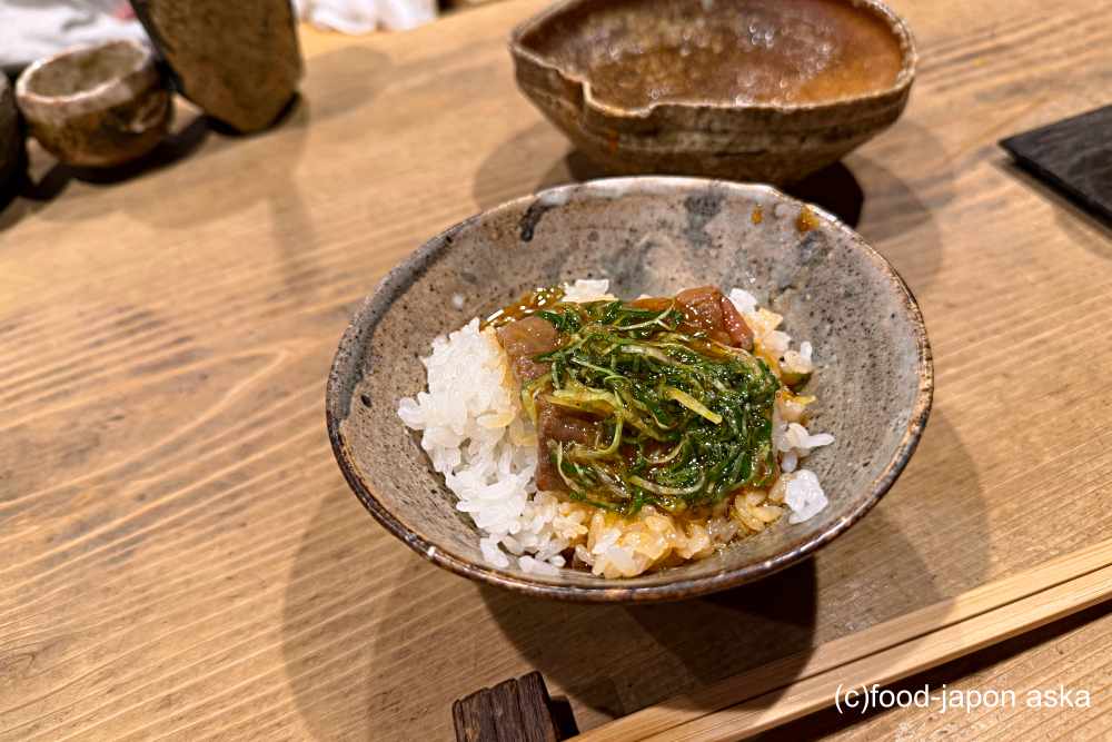 のど黒は、器の中の温かい出汁でゆっくりと火入れされて、しゃぶしゃぶのようにレアでもっちりした食感。岩もずくの食感の対比が良いですね。磯の風味が調味料に。