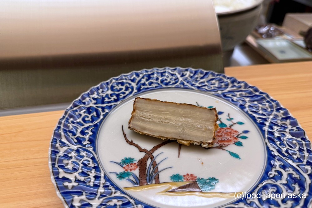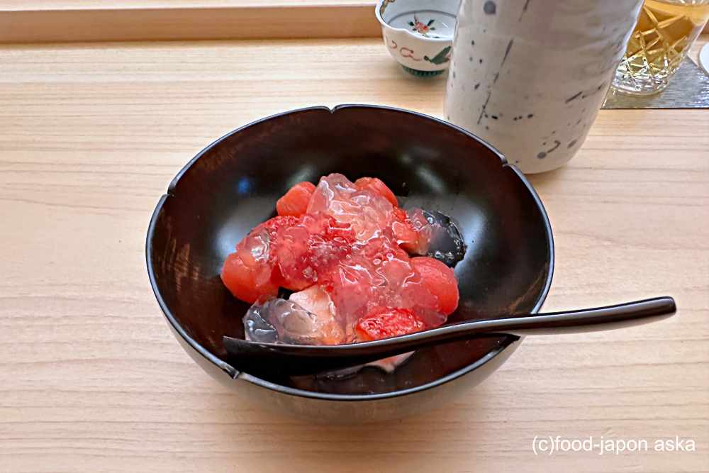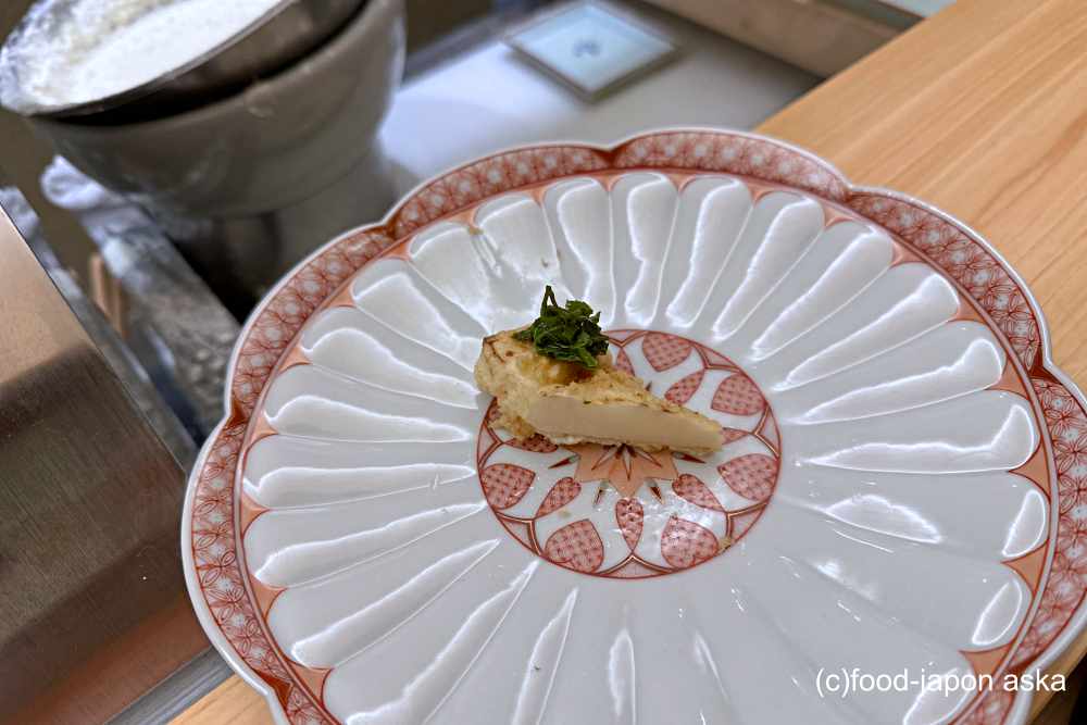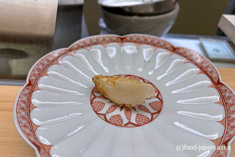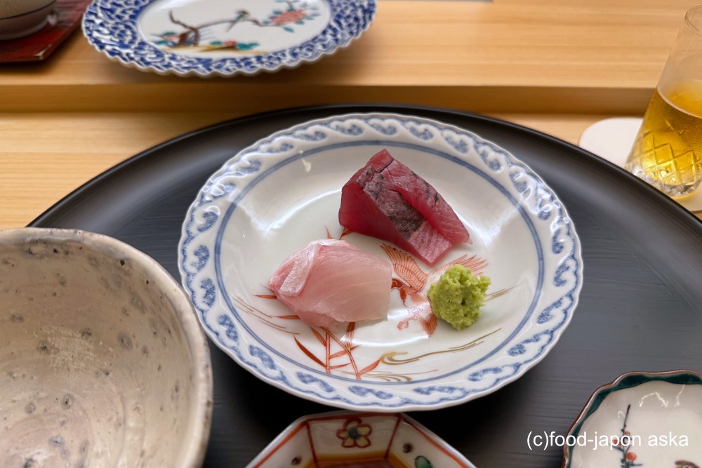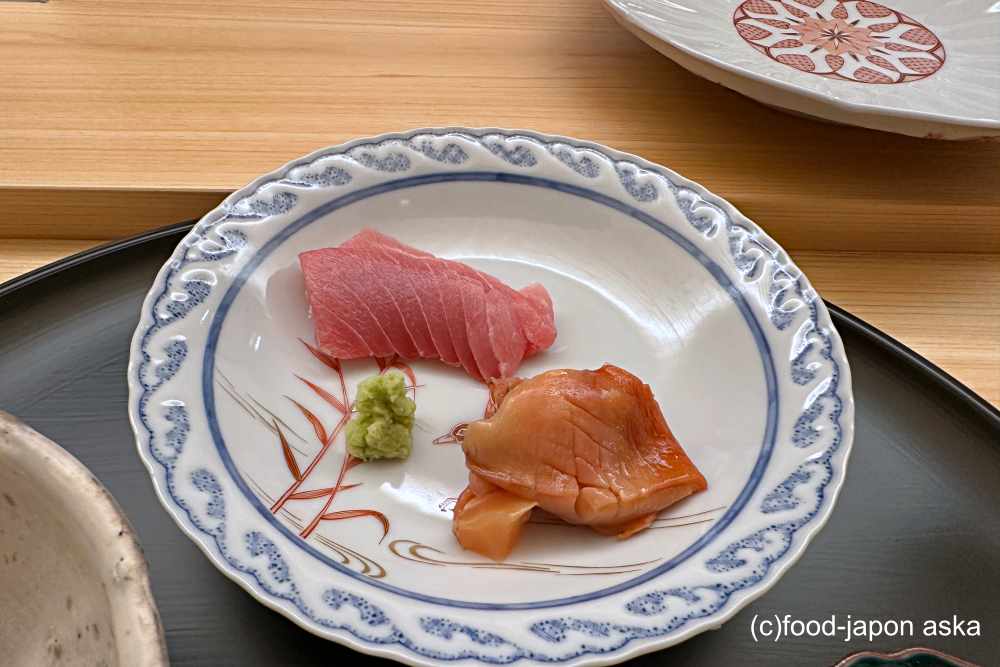 一切めは素材そのまま、二切めは花山椒と木の芽の醤油漬けで香りを添えて。