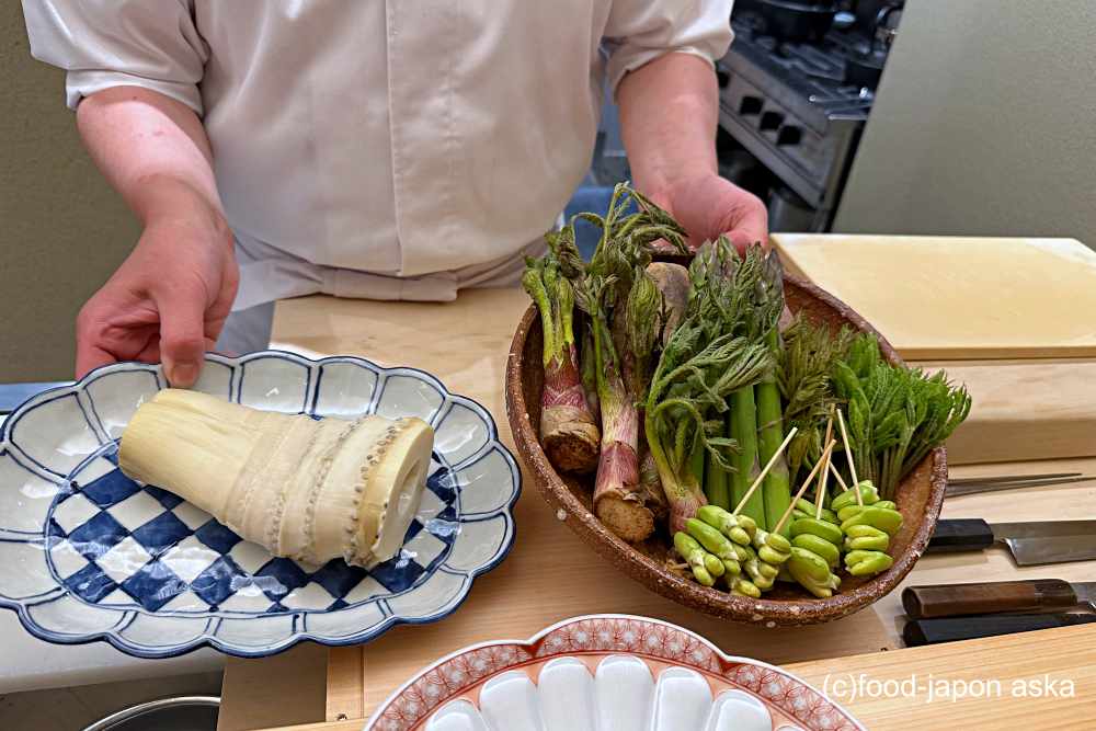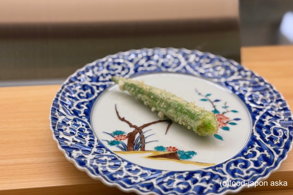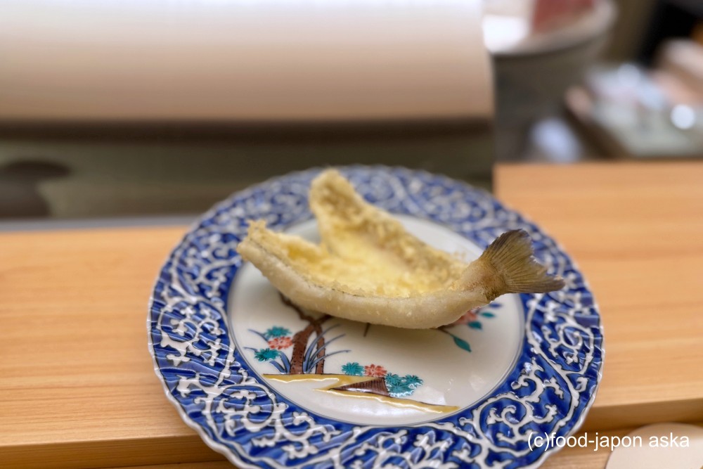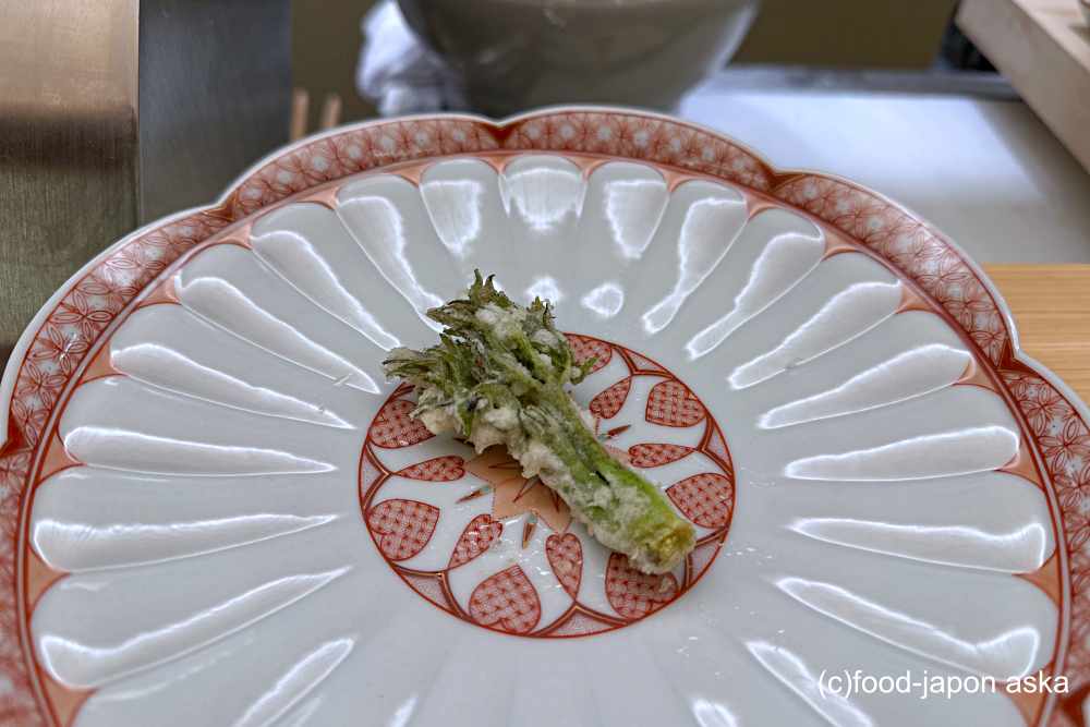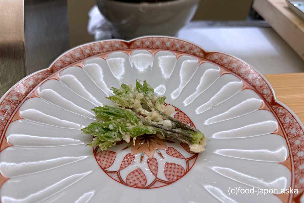 今回は、春食材が豊富。コース内で個人的に特に印象的だったのは、海の稚鮎、虎魚、山独活、タケノコの花山椒と木の芽の醤油漬けのせ、天丼、天バラ。