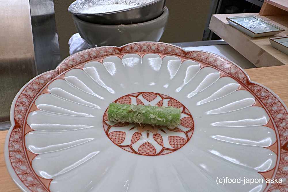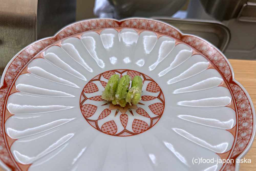 天ぷら1種類目は、旬を感じるそら豆から。ふっくらほくほく、そして青い香りを存分に引き出しています。