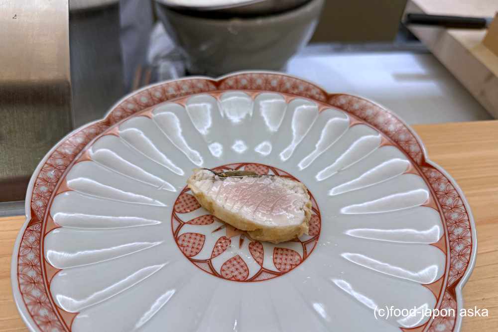 今回のハイライトのひとつ。絶妙な火入れで、子の部分はレア感を残して口の中でソースのようにとろける。