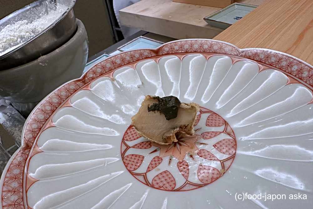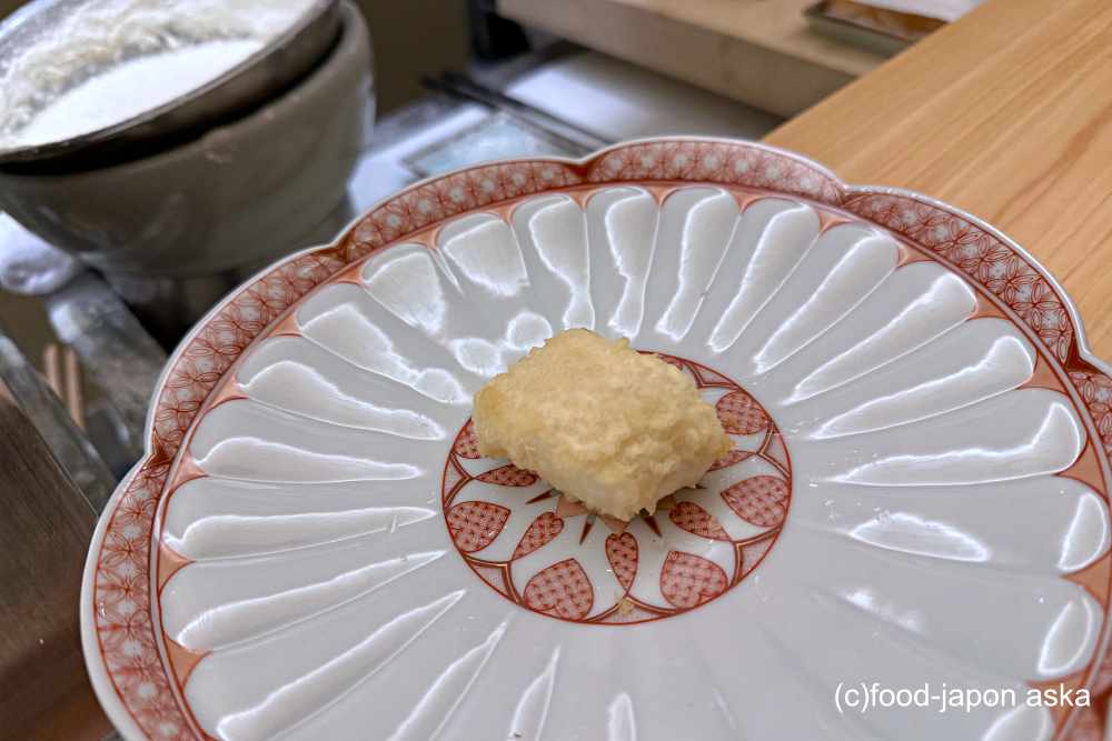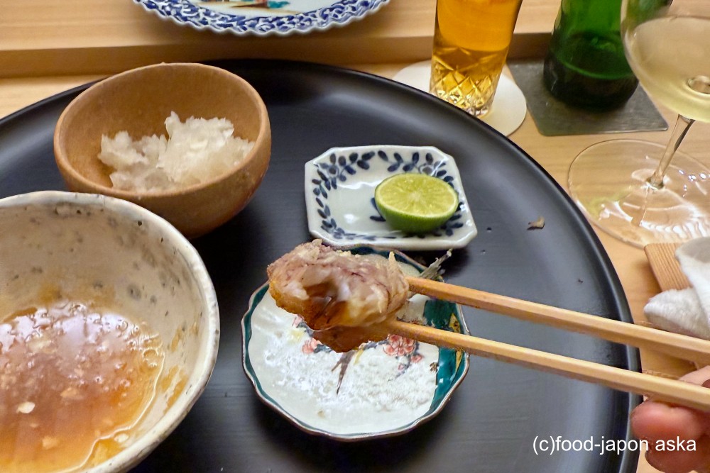 10時間蒸し上げてから天ぷらに揚げに。二切れめは肝のせで。