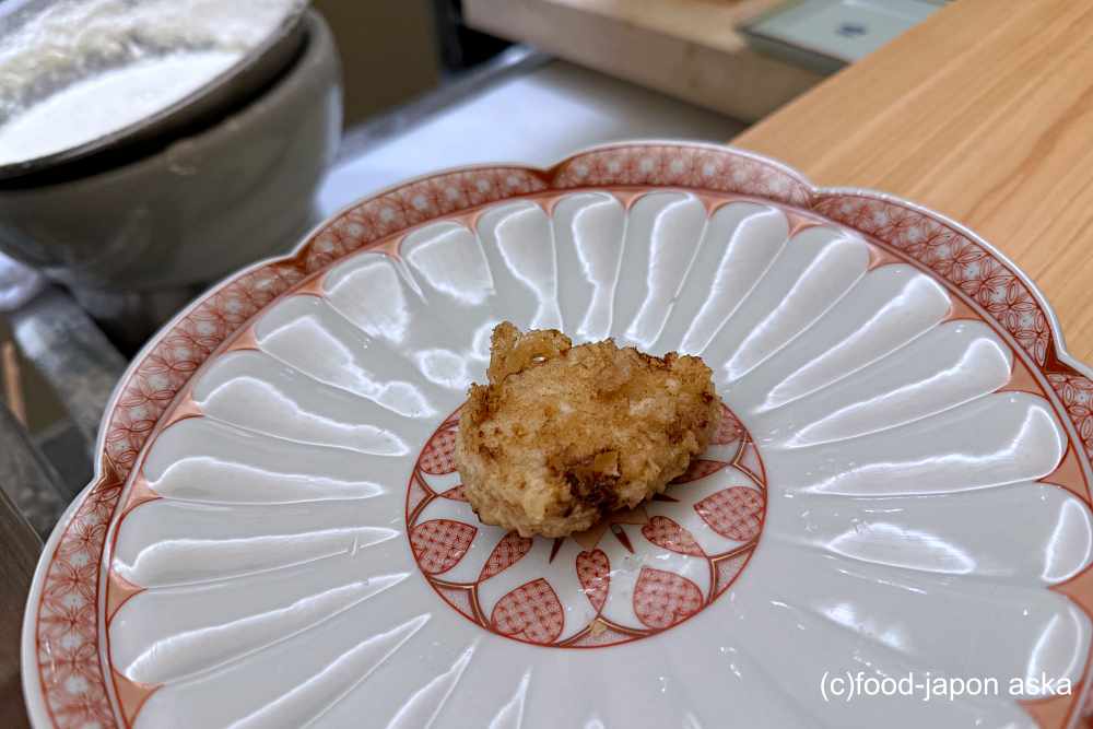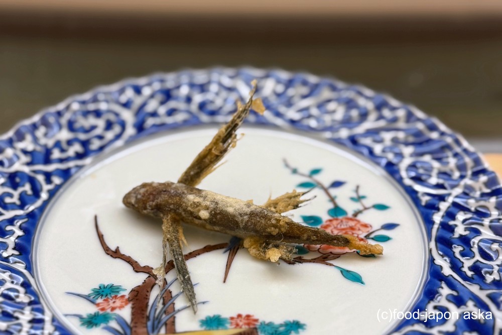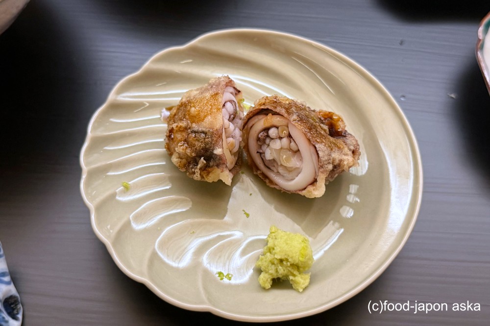 ゲソを射込んで揚げ、中からぷりぷりとした食感と甘みが。新子ならではの瑞々しさに秋を感じます。