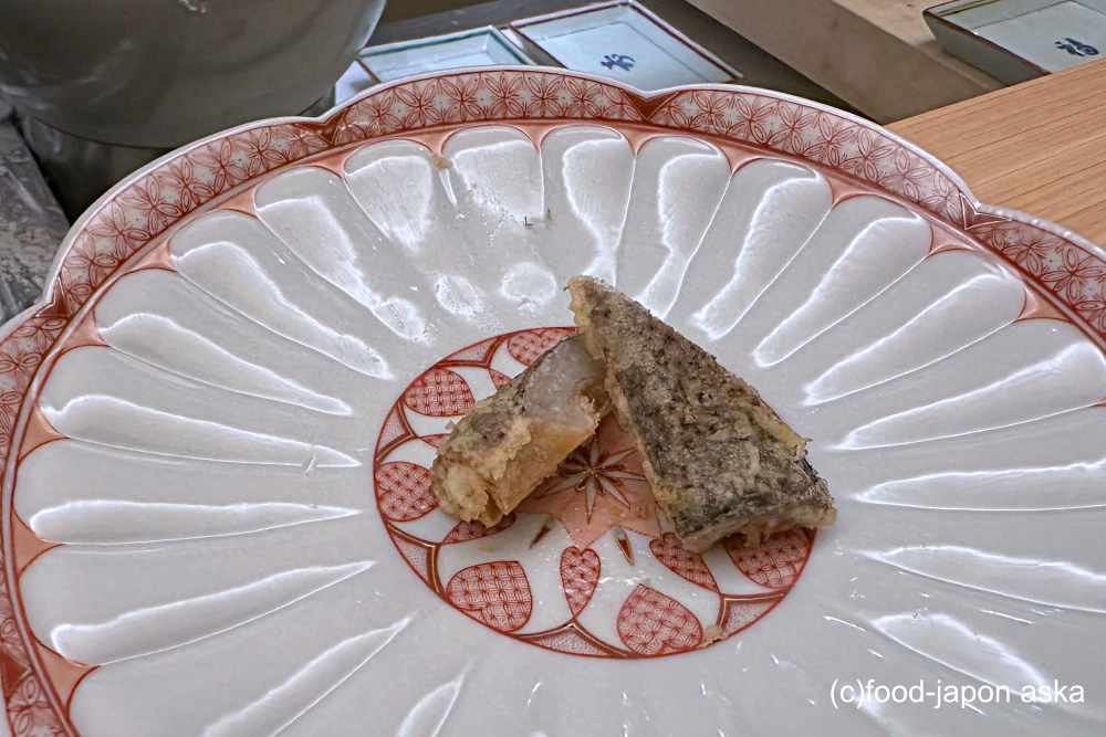 身の方だけに衣を付け、鱗には直接油が入るようにして衣は付けず、揚げ切ることでカリッと歯切れの良い鱗上げが完成。