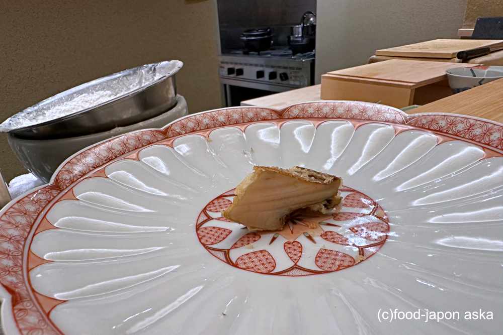 厚切りにして、中はレアにしっとりと仕上げます。腹身は塩、背身は蕗味噌で。