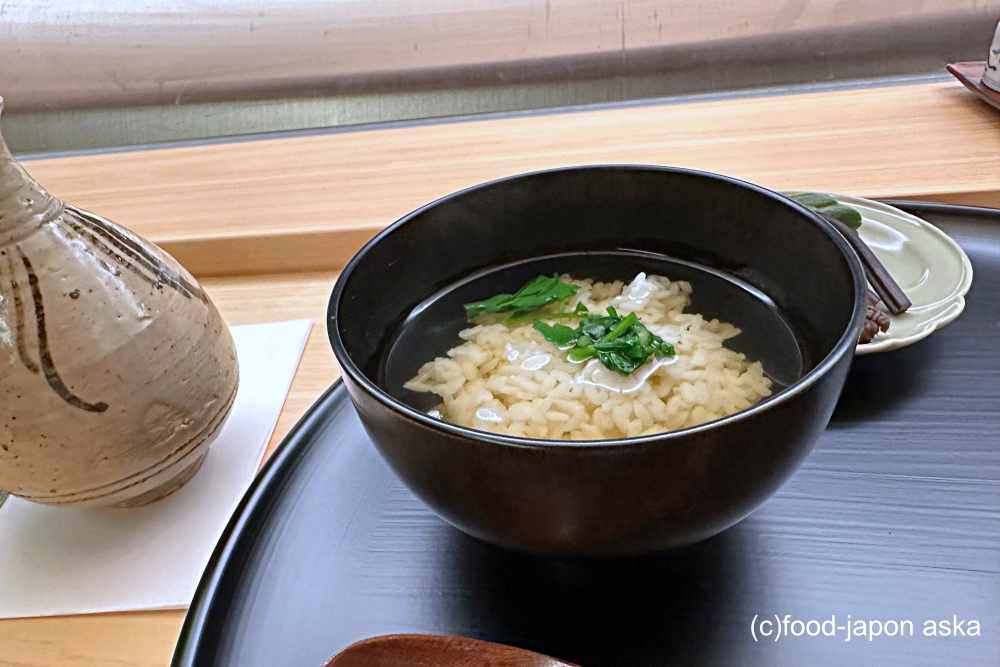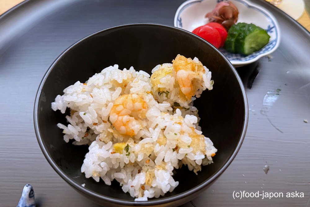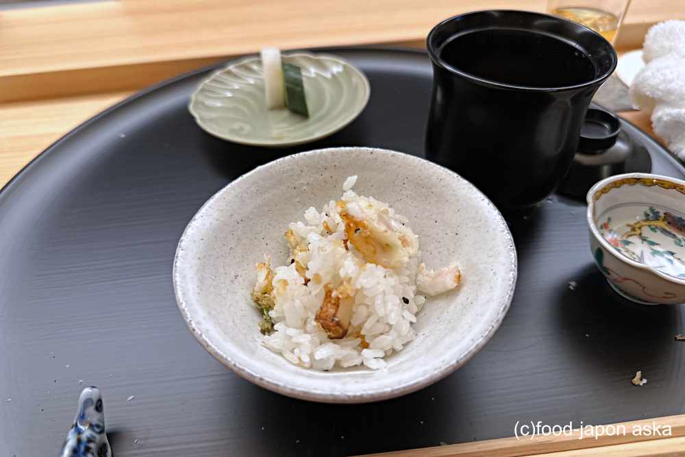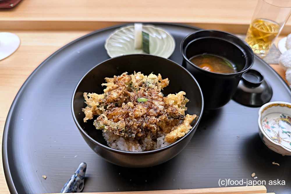 お食事は、天茶漬けか天丼の選択で私は天丼を選び、天バラまでいただきました。白海老・タケノコ・こごみのかき揚げは、コースの最後に春の余韻を残します。