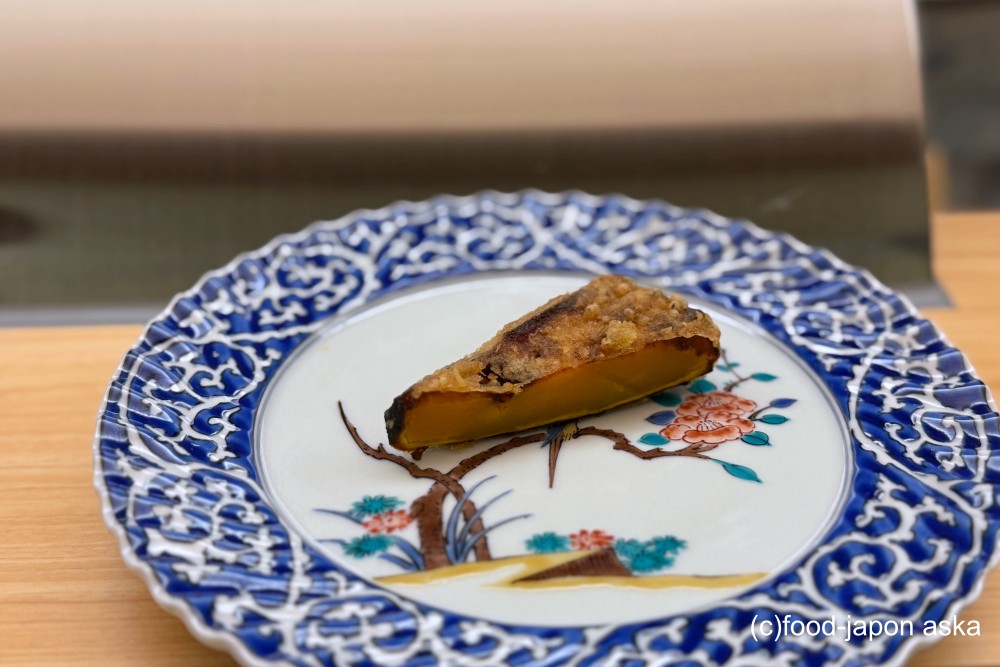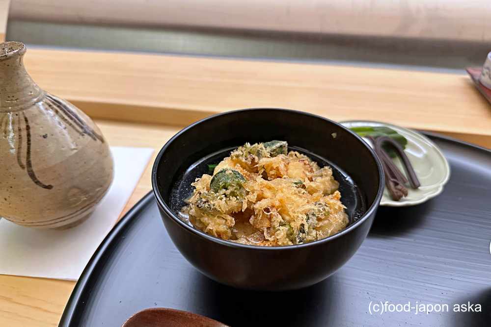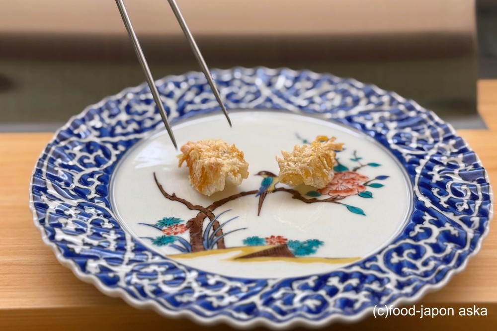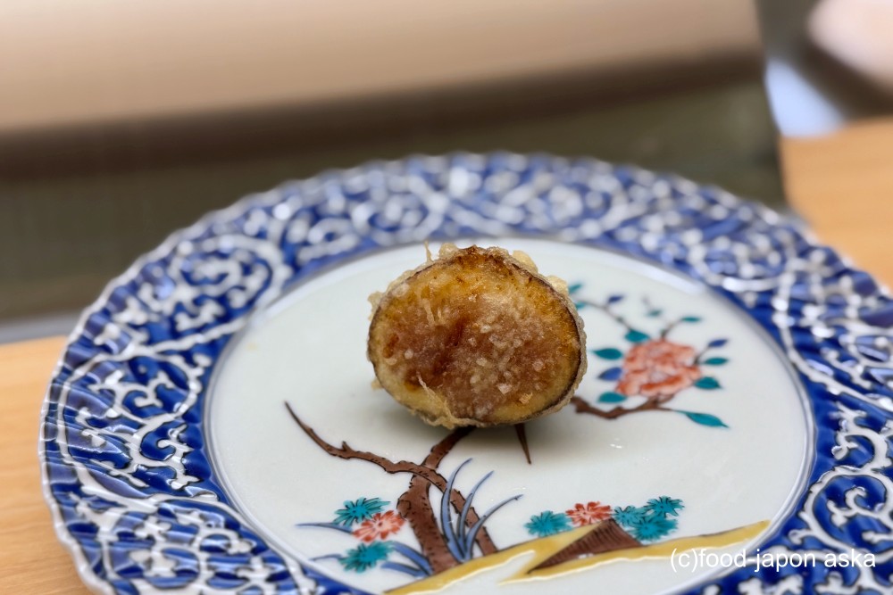 フィレンツェナスは天ぷらにするときめ細やかでクリーミー。出汁あんにはホウキタケとモミタケの旨味が溶け合い、滋味深い味わい。