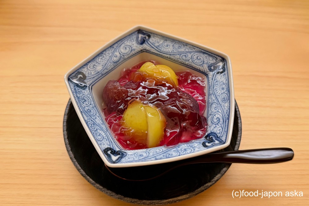 シャインマスカットと巨峰に、巨峰の皮ゼリーを合わせた爽やかな締め。