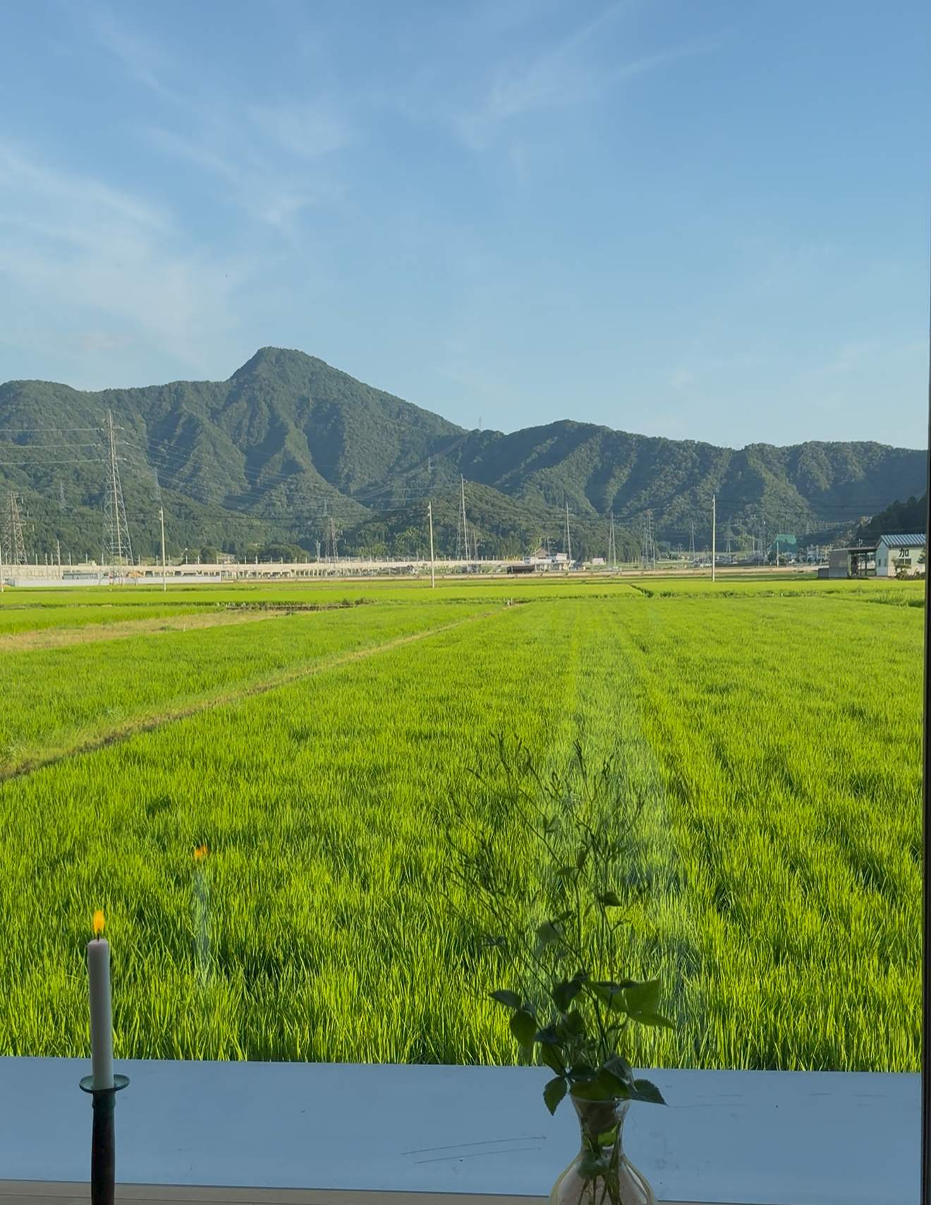 大きく取られた窓からは、越前の原風景がパノラマで楽しめます。陽が落ちてくるまでのマジックアワーもいいですね。
