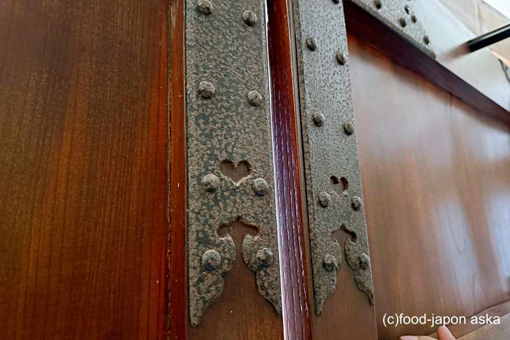 レストランへ続く扉には150年前の越前箪笥の扉を配し、重厚感と趣あり。