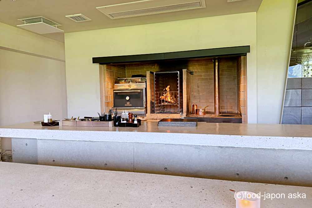 厨房では、薪の焼き台で熾火を巧みに操りながら調理するシェフの姿。(ガスやコンベクションオーブンはなく)ご飯も原始的に薪を熱源とする調理台で炊き上げます。さらに、導入しているのは日本で唯一TSUKIHIさんのみというスペイン「Mibrasa社」製の炭オーブンが存在感を放ちます(左)。