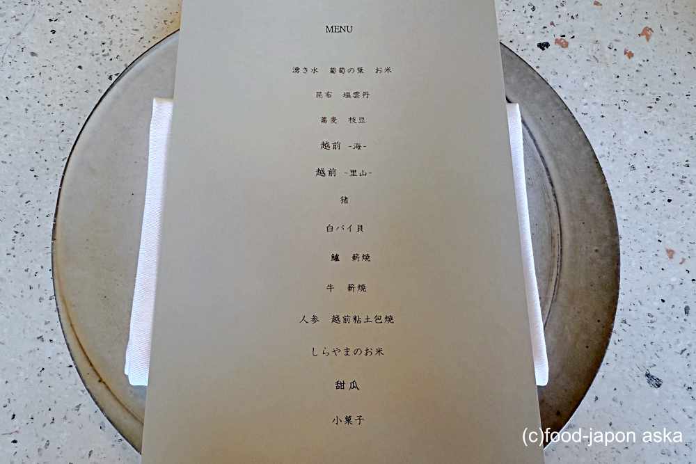 食器やカトラリーは「越前打刃物」や「越前焼」、「高村刃物」などを使用。何から何までメイドイン福井、メイドイン越前のこだわりで、食べる前からもう胸がいっぱい。