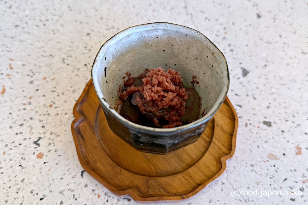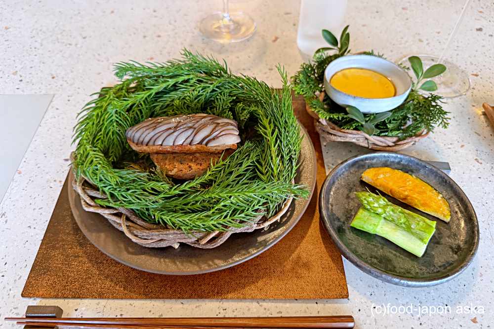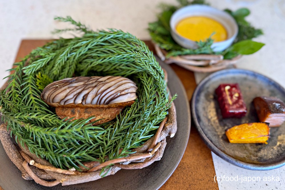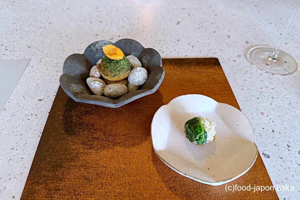 長屋シェフの料理は、地元産の食材や伝統調味料を軸に、原始的な熱源(薪の熾火や炭)を駆使し、コンセプトである「越前テロワール」に輪郭を持たせます。その中でも味わいのコントラストやグラデーションは巧妙な設計で、多皿構成ですが、最初から最後まで小さなお皿の中の小さなパーツにも手を抜いていないのがしっかり伝わります。