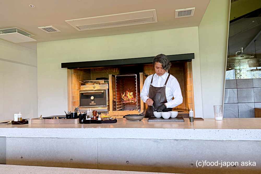 料理長は、長屋恭平シェフ。イタリアの星付き店で研鑽を積み、帰国後は神戸の薪焼きレストラン「erre」で料理長を務めた実力派。2024年より越前に移住し、ワイナリーで葡萄の栽培・醸造から学ぶ。