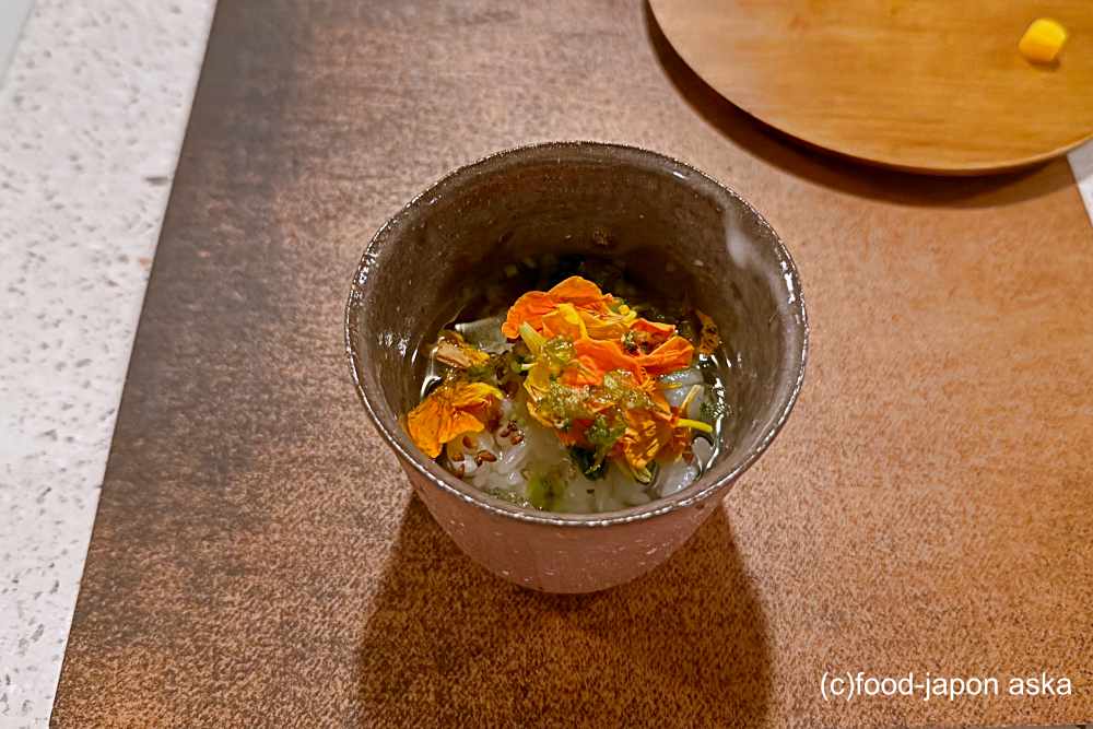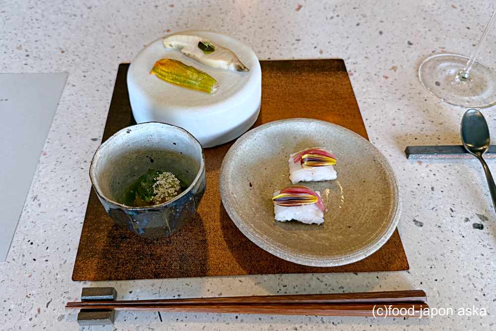 ヒラマサ 胡瓜スープ、穴子、越前鮑、花ズッキーニ ガマエビ 山雲丹オイル