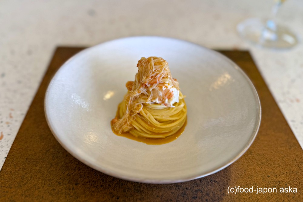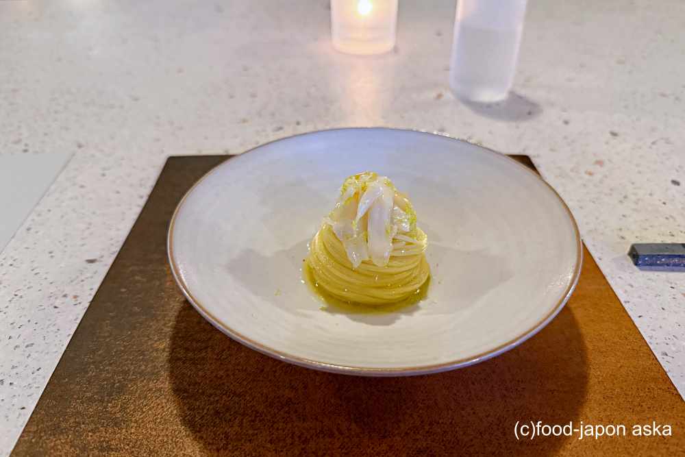 中でも圧巻だったのが「白バイ貝のタリオリーニ」。絶妙な細さとシコシコとした食感に、シェフのパスタの力量の高さと貫禄を感じました。バイ貝の出汁と青柚子でさっぱりと。